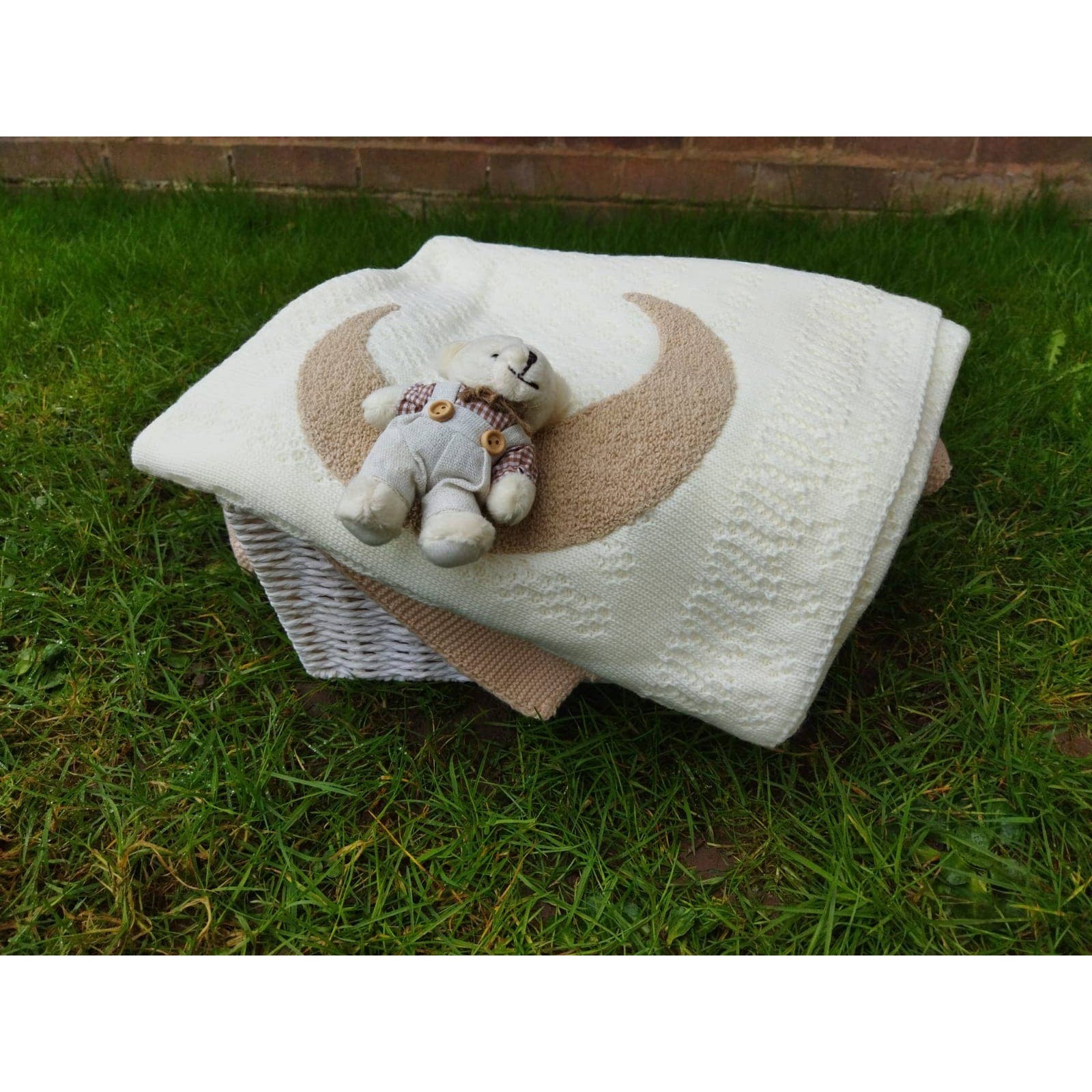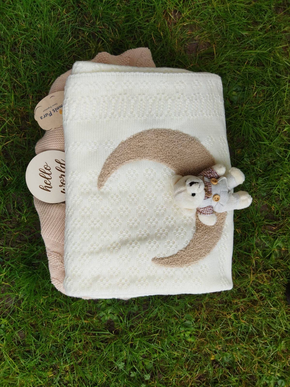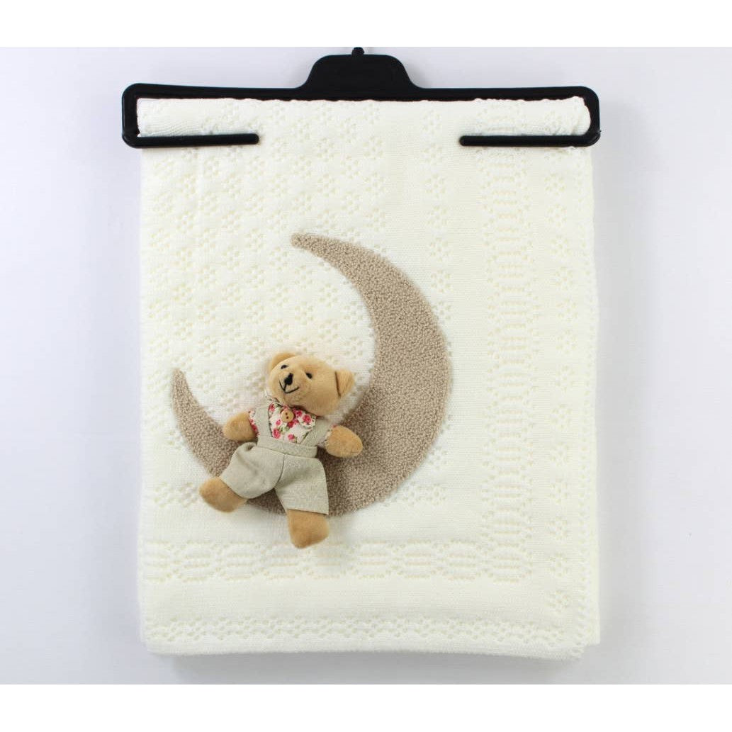 Omnis Pura-Moon and the Teddy Bear One of the blankets we prepared for the new season. It is a coloured baby blanket with a star and moon design that is very comfortable and has been produced to be used for many years. It also has a teddy bear accessory on it. 100*80 cm. 80% Cotton, 20% Acrylic.